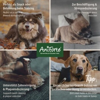 Das AniForte® Hochland Hirschgeweih ist unbehandelt und wird aus den Abwurfstangen der männlichen Hirsche (Rotwild) hergestellt – ein Produkt der Natur! Bitte stelle Deinem Hund immer frisches Wasser zur Verfügung und verfüttere das Geweihstück nur unter Aufsicht. ]
