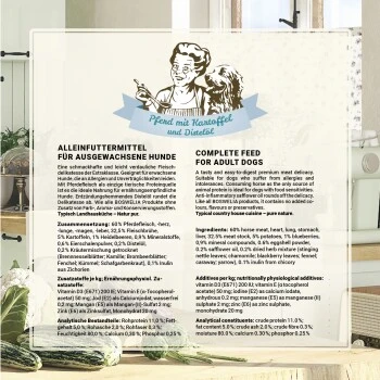 Der Fleischanteil liegt bei 60 %, hinzukommen lediglich Pferdefleischbrühe, Kartoffel, wichtige Mineralstoffe und getrocknete Eierschalen, die die optimale, natürliche Kalziumversorgung gewährleisten.