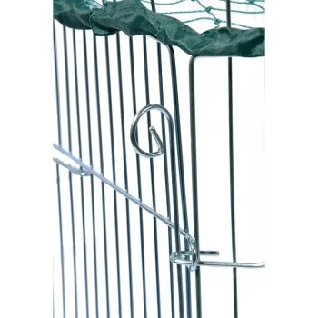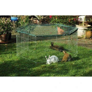 Dieses sechseckige Freilaufgehege bietet Ihren Kaninchen und Hasen einen sicheren Platz im Freien. Das robuste Freigehege ist einfach und schnell aufgebaut und kann dank des Haken-Stecksystem auch ohne Werkzeug montiert werden. Das reißfeste Nylon-Schutznetz verhindert, dass die Kleintiere aus dem Gehege springen und bietet zuverlässigen Schutz vor hungrigen Raubtieren. Das Freigehege ist somit bestens geeignet, um Kaninchen, Hasen, Meerschweinchen und andere Nager im Garten spielen zu lassen. Dank des besonders engmaschigen Gitters (Gitterabstand: ca. 1,4 cm) ist der Auslauf auch für Jungtiere geeignet. Es besteht aus verzinkten Metallstäben und gewährleistet eine gute Wetterbeständigkeit und Langlebigkeit des Geheges. Im Lieferumfang sind je sechs Gitterelemente und Erdanker, sowie ein Schutznetz enthalten. Das Freilaufgehege hat Außenmaße von ca. 123 x 106 x 60 cm (L x B x H) und eine Innenfläche von ca. 1,0 m². Das Gewicht beträgt ca. 4 kg.