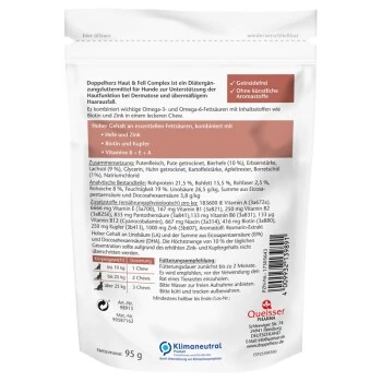 Die leckeren Haut & Fell Complex Chews für Hunde enthalten hochdosierte aktive Komponenten. Mit Frischfleisch und ohne künstliche Aromastoffe. Die optimal kombinierten Inhaltstoffe sind wirksam bei der Unterstützung der Hautfunktion bei Dermatose und übermäßigem Haarausfall. Haut und Fell befinden sich in einem Zustand ständiger Erneuerung und benötigen hierfür mit der Nahrung zugeführte Nährstoffe. Besonders wichtig für den Erhalt und die Regeneration der Haut sind die Spurenelemente Kupfer und Zink sowie die Vitamine B, E und A. Hefe dient als natürlicher Lieferant von Biotin und B-Vitaminen. Die Chews enthalten zudem wertvolle Omega-3 und Omega-6 Fettsäuren aus Lachs- und Borretsch öl. Essentielle Fettsäuren unterstützen die Hautfunktion und sind somit wichtig bei Dermatosen und übermäßigem Haarausfall. Doppelherz ist eine der bekanntesten Gesundheitsmarken Deutschlands. Bereits seit über 100 Jahren werden Gesundheitsprodukte mit hoher Qualität entwickelt, welche ausschließlich geprüfte und hochwertige Inhaltsstoffe beinhalten. Doppelherz steht heute für den Erhalt des gesunden Wohlbefindens der ganzen Familie – und somit natürlich auch von Hund und Katze. Alle Doppelherz-Produkte werden klimaneutral hergestellt. Treibhausgase, die in der Prozesskette unvermeidlich entstehen, werden über anerkannte Klimaschutzprojekte ausgeglichen.
