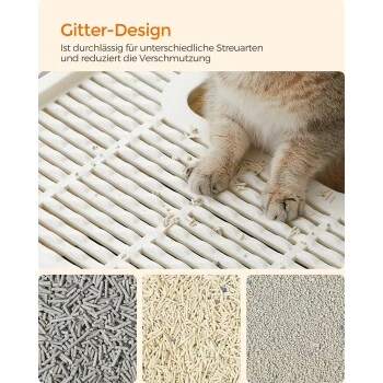 - – Kein Auslaufen: Ein verlängerter Rand oberhalb der Box und ein geschlossener Boden darunter verhindern, dass Streu oder Urin auf den Boden gelangen.
