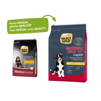 SELECT GOLD Complete Medium Junior Huhn ist eine speziell entwickelte, ausgewogene Premium-Trockennahrung für Welpen und Junghunde vom Absetzen bis zum ca. 12. Lebensmonat sowie für tragende und säugende Hündinnen mittelgroßer Rassen (Endgewicht 11–25kg). Diese hochqualitative Trockennahrung wird unter Verwendung von schmackhaftem Hühnerfrischfleisch hergestellt und zeichnet sich durch hohe Akzeptanz und Verträglichkeit aus. Bei der Entwicklung dieser Premium-Rezeptur wurden die ernährungsphysiologischen Anforderungen von Welpen und Junghunden im Wachstum gezielt berücksichtigt.